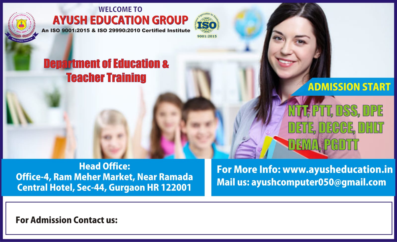 Ayush Education Group is an Educational Organization, Registered under ITR Act 1882 Reg. No. Is UP/2020/24 from Govt of India and Run By Gurukul Saksharta Mission (Regd Under Act XXI of 1860) Govt of NCT of Delhi. Reg.No. GSM/00536/NE/2011, Govt of India. Our aim is to Educate & develop more people. We provide All types of Education, like as- Computer Education, Vocational Education, Early Childhood Education, Physical & Yoga Education, Fine Art Education. We designed our courses completely practically & job oriented. We also assist our students in various types of job at time to time after completing the Courses. At Present various Study Centers are running in different State of India .Educational experts. As a Non-Governmental Organization (NGO), Ayush is trying to make successful the vocational training & Skill programme of Social welfare Board, Govt. of India, by imparting Nursery Teacher Training to unemployed educated women. Believing strongly in our motto of education for all, we are committed to doing high quality work and creating sustainable growth for ourselves, our associates and our students.